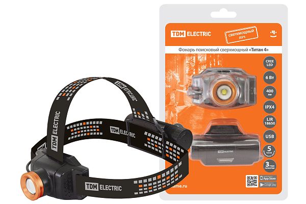 К светотехнике на любом объекте, будь то жилое помещение или коммерческая площадка, предъявляют высокие требования. Необходимо не только продумать конфигурацию всех приборов, безопасную схему подключения, суммарную мощность и нагрузку на сеть, но и учесть требования дизайна, поскольку эстетике сегодня уделяется большое внимание. Фонарь «Титан 4» налобный, 6 Вт 1 светодиод CREE 400 лм, 1х18650 3.7 В 2200 мА*ч, IPX4, USB, TDM (SQ0350-0064) — современное решение, в котором учтены все требования. За надежность отвечают материалы с большим запасом прочности. Все элементы конструкции без проблем выдерживают интенсивную эксплуатацию. Такой вдумчивый подход к деталям является визитной карточкой бренда TDM.