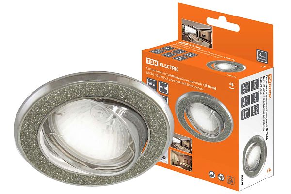 К светотехнике на любом объекте, будь то жилое помещение или коммерческая площадка, предъявляют высокие требования. Необходимо не только продумать конфигурацию всех приборов, безопасную схему подключения, суммарную мощность и нагрузку на сеть, но и учесть требования дизайна, поскольку эстетике сегодня уделяется большое внимание. Светильник встраиваемый поворотный СВ 02-06 MR16 50Вт G5.3 серебряный блеск/хром TDM (SQ0359-0036) — современное решение, в котором учтены все требования. За надежность отвечают материалы с большим запасом прочности. Все элементы конструкции без проблем выдерживают интенсивную эксплуатацию. Такой вдумчивый подход к деталям является визитной карточкой бренда TDM.