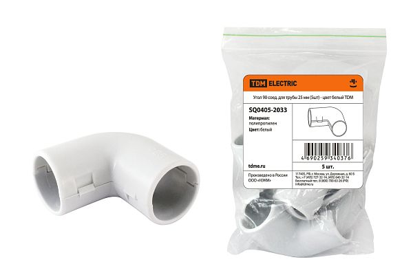 Электротехническая инфраструктура на объекте может иметь разную конфигурацию, в том числе довольно сложную со множеством подключенных потребителей, однако строгие требования к безопасности неизменны. Они прописаны в отраслевых стандартах и другой нормативной документации. И зависит итоговый результат непосредственно от качества электромонтажа и используемых комплектующих. Угол 90 соед. для трубы 25 мм (5шт) - цвет белый TDM (SQ0405-2033) — небольшая, но очень важная деталь, которая тоже отвечает за корректную работу оборудования. Устанавливается довольно просто, но с эксплуатационными нагрузками при этом справляется на отлично. Качество гарантировано многоступенчатым контролем на заводе TDM. При заказе уточните артикул SQ0405-2033 и количество позиций.