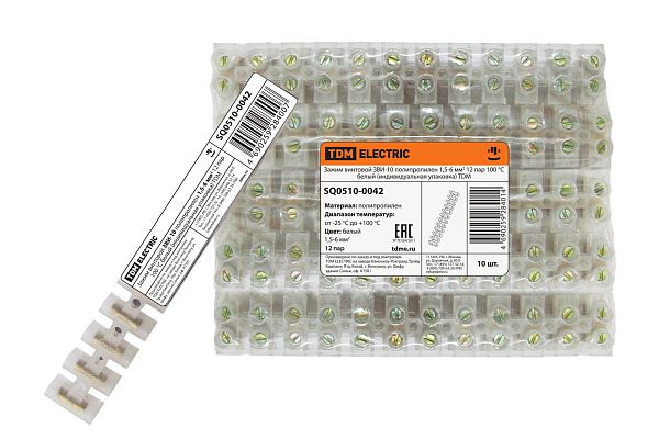 Электротехническая инфраструктура на объекте может иметь разную конфигурацию, в том числе довольно сложную со множеством подключенных потребителей, однако строгие требования к безопасности неизменны. Они прописаны в отраслевых стандартах и другой нормативной документации. И зависит итоговый результат непосредственно от качества электромонтажа и используемых комплектующих. Зажим винтовой ЗВИ-10 полипропилен 1,5-6мм2 12пар 100°С белый (индивидуальная упаковка) TDM (SQ0510-0042) — небольшая, но очень важная деталь, которая тоже отвечает за корректную работу оборудования. Устанавливается довольно просто, но с эксплуатационными нагрузками при этом справляется на отлично. Качество гарантировано многоступенчатым контролем на заводе TDM. При заказе уточните артикул SQ0510-0042 и количество позиций.