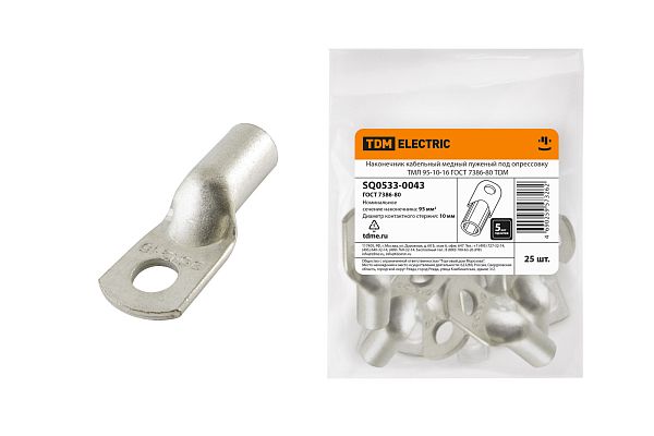 Электротехническая инфраструктура на объекте может иметь разную конфигурацию, в том числе довольно сложную со множеством подключенных потребителей, однако строгие требования к безопасности неизменны. Они прописаны в отраслевых стандартах и другой нормативной документации. И зависит итоговый результат непосредственно от качества электромонтажа и используемых комплектующих. Наконечник медный луженый ТМЛ 95-10-16 ГОСТ 7386-80 TDM (SQ0533-0043) — небольшая, но очень важная деталь, которая тоже отвечает за корректную работу оборудования. Устанавливается довольно просто, но с эксплуатационными нагрузками при этом справляется на отлично. Качество гарантировано многоступенчатым контролем на заводе TDM. При заказе уточните артикул SQ0533-0043 и количество позиций.