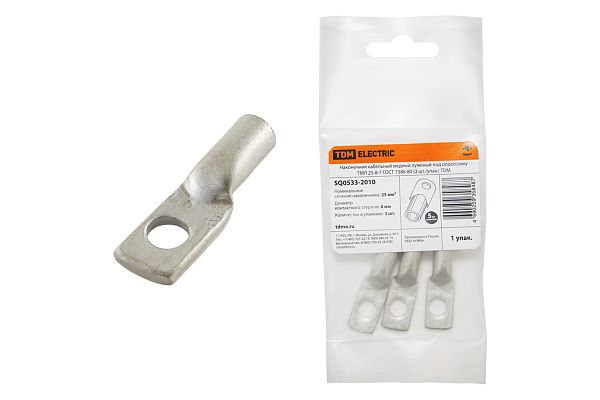 Электротехническая инфраструктура на объекте может иметь разную конфигурацию, в том числе довольно сложную со множеством подключенных потребителей, однако строгие требования к безопасности неизменны. Они прописаны в отраслевых стандартах и другой нормативной документации. И зависит итоговый результат непосредственно от качества электромонтажа и используемых комплектующих. Наконечник медный луженый ТМЛ 25-8-7 ГОСТ 7386-80 (3 шт./упак.) TDM (SQ0533-2010) — небольшая, но очень важная деталь, которая тоже отвечает за корректную работу оборудования. Устанавливается довольно просто, но с эксплуатационными нагрузками при этом справляется на отлично. Качество гарантировано многоступенчатым контролем на заводе TDM. При заказе уточните артикул SQ0533-2010 и количество позиций.