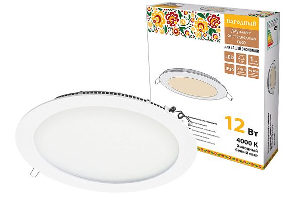 К светотехнике на любом объекте, будь то жилое помещение или коммерческая площадка, предъявляют высокие требования. Необходимо не только продумать конфигурацию всех приборов, безопасную схему подключения, суммарную мощность и нагрузку на сеть, но и учесть требования дизайна, поскольку эстетике сегодня уделяется большое внимание. Светильник ультратонкий встраиваемый светодиодный "Даунлайт НАРОДНЫЙ" СВО (белый) 12 Вт 4000К TDM (SQ0329-0080) — современное решение, в котором учтены все требования. За надежность отвечают материалы с большим запасом прочности. Все элементы конструкции без проблем выдерживают интенсивную эксплуатацию. Такой вдумчивый подход к деталям является визитной карточкой бренда TDM.