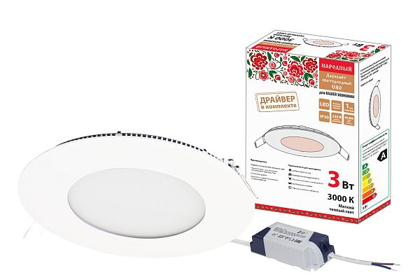 К светотехнике на любом объекте, будь то жилое помещение или коммерческая площадка, предъявляют высокие требования. Необходимо не только продумать конфигурацию всех приборов, безопасную схему подключения, суммарную мощность и нагрузку на сеть, но и учесть требования дизайна, поскольку эстетике сегодня уделяется большое внимание. Светильник ультратонкий встраиваемый светодиодный "Даунлайт НАРОДНЫЙ" СВО (белый) 3 Вт 3000К TDM (SQ0329-0093) — современное решение, в котором учтены все требования. За надежность отвечают материалы с большим запасом прочности. Все элементы конструкции без проблем выдерживают интенсивную эксплуатацию. Такой вдумчивый подход к деталям является визитной карточкой бренда TDM.