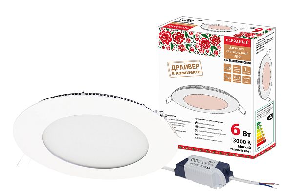 К светотехнике на любом объекте, будь то жилое помещение или коммерческая площадка, предъявляют высокие требования. Необходимо не только продумать конфигурацию всех приборов, безопасную схему подключения, суммарную мощность и нагрузку на сеть, но и учесть требования дизайна, поскольку эстетике сегодня уделяется большое внимание. Светильник ультратонкий встраиваемый светодиодный "Даунлайт НАРОДНЫЙ" СВО (белый) 6 Вт 3000К TDM (SQ0329-0094) — современное решение, в котором учтены все требования. За надежность отвечают материалы с большим запасом прочности. Все элементы конструкции без проблем выдерживают интенсивную эксплуатацию. Такой вдумчивый подход к деталям является визитной карточкой бренда TDM.