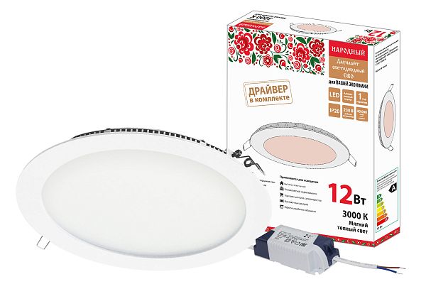 К светотехнике на любом объекте, будь то жилое помещение или коммерческая площадка, предъявляют высокие требования. Необходимо не только продумать конфигурацию всех приборов, безопасную схему подключения, суммарную мощность и нагрузку на сеть, но и учесть требования дизайна, поскольку эстетике сегодня уделяется большое внимание. Светильник ультратонкий встраиваемый светодиодный "Даунлайт НАРОДНЫЙ" СВО (белый) 12 Вт 3000К TDM (SQ0329-0095) — современное решение, в котором учтены все требования. За надежность отвечают материалы с большим запасом прочности. Все элементы конструкции без проблем выдерживают интенсивную эксплуатацию. Такой вдумчивый подход к деталям является визитной карточкой бренда TDM.