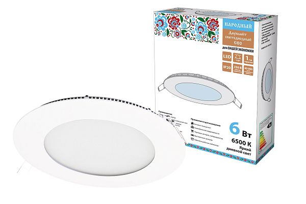 К светотехнике на любом объекте, будь то жилое помещение или коммерческая площадка, предъявляют высокие требования. Необходимо не только продумать конфигурацию всех приборов, безопасную схему подключения, суммарную мощность и нагрузку на сеть, но и учесть требования дизайна, поскольку эстетике сегодня уделяется большое внимание. Светильник ультратонкий встраиваемый светодиодный "Даунлайт НАРОДНЫЙ" СВО (белый) 6 Вт 6500К TDM (SQ0329-0245) — современное решение, в котором учтены все требования. За надежность отвечают материалы с большим запасом прочности. Все элементы конструкции без проблем выдерживают интенсивную эксплуатацию. Такой вдумчивый подход к деталям является визитной карточкой бренда TDM.