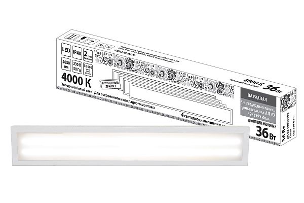 К светотехнике на любом объекте, будь то жилое помещение или коммерческая площадка, предъявляют высокие требования. Необходимо не только продумать конфигурацию всех приборов, безопасную схему подключения, суммарную мощность и нагрузку на сеть, но и учесть требования дизайна, поскольку эстетике сегодня уделяется большое внимание. Светодиодная панель универсальная ЛП 03 180х1195 Опал 19 мм 36 Вт 2650 Лм, 4000 К, белая, Народная TDM (SQ0329-0277) — современное решение, в котором учтены все требования. За надежность отвечают материалы с большим запасом прочности. Все элементы конструкции без проблем выдерживают интенсивную эксплуатацию. Такой вдумчивый подход к деталям является визитной карточкой бренда TDM.