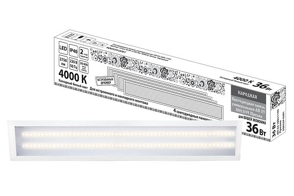 К светотехнике на любом объекте, будь то жилое помещение или коммерческая площадка, предъявляют высокие требования. Необходимо не только продумать конфигурацию всех приборов, безопасную схему подключения, суммарную мощность и нагрузку на сеть, но и учесть требования дизайна, поскольку эстетике сегодня уделяется большое внимание. Светодиодная панель универсальная ЛП 03 180х1195 Призма 19 мм 36 Вт 2750 Лм, 4000 К, белая, Народная TDM (SQ0329-0281) — современное решение, в котором учтены все требования. За надежность отвечают материалы с большим запасом прочности. Все элементы конструкции без проблем выдерживают интенсивную эксплуатацию. Такой вдумчивый подход к деталям является визитной карточкой бренда TDM.