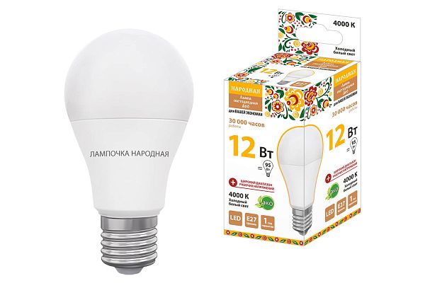 К светотехнике на любом объекте, будь то жилое помещение или коммерческая площадка, предъявляют высокие требования. Необходимо не только продумать конфигурацию всех приборов, безопасную схему подключения, суммарную мощность и нагрузку на сеть, но и учесть требования дизайна, поскольку эстетике сегодня уделяется большое внимание. Лампа светодиодная НЛ-LED-A60-12 Вт-230 В-4000 К-Е27, (60х108 мм), Народная TDM (SQ0340-1512) — современное решение, в котором учтены все требования. За надежность отвечают материалы с большим запасом прочности. Все элементы конструкции без проблем выдерживают интенсивную эксплуатацию. Такой вдумчивый подход к деталям является визитной карточкой бренда TDM.