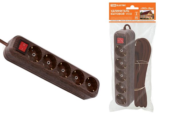 При подборе розеток, выключателей и других элементов для работы с электроэнергией учитывают не только электротехнические параметры, но и эстетику. Удлинитель бытовой У05В выключатель, 5 гнезд, 3метра,2П+3, ПВС 3х1мм2 "Эко" (бук) 16А/250В TDM (SQ1303-3121) — одна из лучших моделей в своем классе по обоим критериям. Производитель TDM сделал ставку на простую надежную конструкцию и современные материалы, которые обладают высокой устойчивостью к износу. Продукция прошла строгую проверку на безопасность и рассчитана на многолетнюю эксплуатацию в интенсивном режиме. Как официальный дистрибьютор мы готовы поставить любое количество товаров в кратчайшие сроки.
