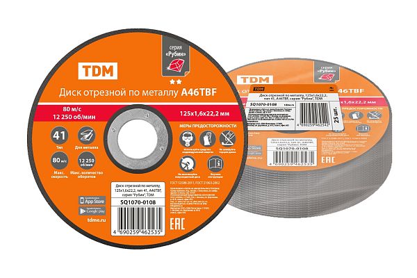 Залогом качественного электромонтажа является правильный выбор расходников и инструмента. Диск отрезной по металлу, 125х1,6х22,2, тип 41, A46TBF, серия "Рубин", TDM (SQ1070-0108) — проверенное решение, с которым работа пойдет гораздо быстрее, а результат будет соответствовать строгим отраслевым стандартам и другим нормативным требованиям. Позиция SQ1070-0108 пользуется спросом и у профессионалов, обслуживающих сложные и ответственные объекты, и у обычных пользователей, которые сталкиваются с аналогичными задачами в быту. Работать с товарами TDM действительно просто, а их быструю доставку мы берем на себя.