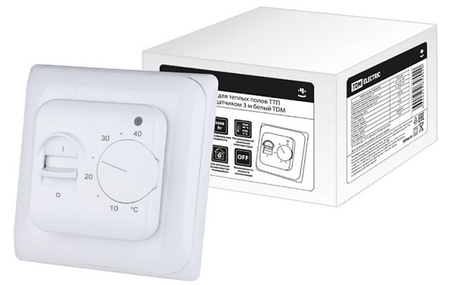 Система «теплый пол» — отличная альтернатива традиционным радиаторам или хороший вариант дополнительного обогрева. Главное, что она не занимает полезную площадь, а укладывается под напольное покрытие, и хорошо протапливает помещение. Термостат для теплых полов ТТП 16А 250В с датчиком 3 м белый TDM (SQ1805-1062) и другие комплектующие из нашего каталога позволят быстро создать идеальный микроклимат. У TDM в этом плане одни из самых продуманных решений. Производитель сделал ставку на безопасность и максимальную эффективность, поэтому продукцию быстро оценили и профессионалы рынка, и обычные пользователи, которые самостоятельно занимаются ремонтом.