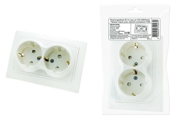 При подборе розеток, выключателей и других элементов для работы с электроэнергией учитывают не только электротехнические параметры, но и эстетику. Розетка двойная 2П+З с защ. шт. 16А 250В белая "Таймыр" (пром. упак., бакелит. основание) TDM (SQ1814-0518) — одна из лучших моделей в своем классе по обоим критериям. Производитель TDM сделал ставку на простую надежную конструкцию и современные материалы, которые обладают высокой устойчивостью к износу. Продукция прошла строгую проверку на безопасность и рассчитана на многолетнюю эксплуатацию в интенсивном режиме. Как официальный дистрибьютор мы готовы поставить любое количество товаров в кратчайшие сроки.