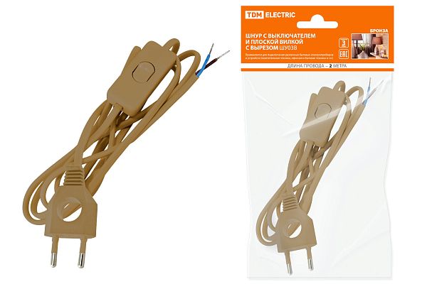 При подборе розеток, выключателей и других элементов для работы с электроэнергией учитывают не только электротехнические параметры, но и эстетику. Шнур с выключателем и плоской вилкой с вырезом ШУ03В ШВВП 2х0,75мм2 2 м. бронза TDM (SQ1305-0023) — одна из лучших моделей в своем классе по обоим критериям. Производитель TDM сделал ставку на простую надежную конструкцию и современные материалы, которые обладают высокой устойчивостью к износу. Продукция прошла строгую проверку на безопасность и рассчитана на многолетнюю эксплуатацию в интенсивном режиме. Как официальный дистрибьютор мы готовы поставить любое количество товаров в кратчайшие сроки.