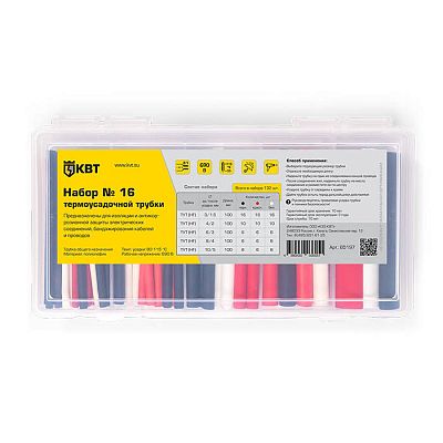 Электротехническая инфраструктура на объекте может иметь разную конфигурацию, в том числе довольно сложную со множеством подключенных потребителей, однако строгие требования к безопасности неизменны. Они прописаны в отраслевых стандартах и другой нормативной документации. И зависит итоговый результат непосредственно от качества электромонтажа и используемых комплектующих. Набор термоусадочных трубок №16 в пластмассовом боксе в нарезке по 100 мм КВТ (85197) — небольшая, но очень важная деталь, которая тоже отвечает за корректную работу оборудования. Устанавливается довольно просто, но с эксплуатационными нагрузками при этом справляется на отлично. Качество гарантировано многоступенчатым контролем на заводе КВТ. При заказе уточните артикул 85197 и количество позиций.