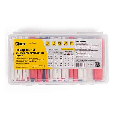 Электротехническая инфраструктура на объекте может иметь разную конфигурацию, в том числе довольно сложную со множеством подключенных потребителей, однако строгие требования к безопасности неизменны. Они прописаны в отраслевых стандартах и другой нормативной документации. И зависит итоговый результат непосредственно от качества электромонтажа и используемых комплектующих. Наборы клеевых термоусадочных трубок №12 в пластмассовом боксе в нарезке по 100 мм КВТ (85193) — небольшая, но очень важная деталь, которая тоже отвечает за корректную работу оборудования. Устанавливается довольно просто, но с эксплуатационными нагрузками при этом справляется на отлично. Качество гарантировано многоступенчатым контролем на заводе КВТ. При заказе уточните артикул 85193 и количество позиций.