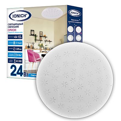 К светотехнике на любом объекте, будь то жилое помещение или коммерческая площадка, предъявляют высокие требования. Необходимо не только продумать конфигурацию всех приборов, безопасную схему подключения, суммарную мощность и нагрузку на сеть, но и учесть требования дизайна, поскольку эстетике сегодня уделяется большое внимание. Светильник светодиодный декоративный ТМ IONICH серия 2221 "Орион" эффект "Звездное небо" 24 Вт 1680 Лм 230 В 6500 К 320 мм IP20 (1717) — современное решение, в котором учтены все требования. За надежность отвечают материалы с большим запасом прочности. Все элементы конструкции без проблем выдерживают интенсивную эксплуатацию. Такой вдумчивый подход к деталям является визитной карточкой бренда IONICH.