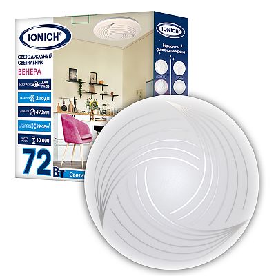 К светотехнике на любом объекте, будь то жилое помещение или коммерческая площадка, предъявляют высокие требования. Необходимо не только продумать конфигурацию всех приборов, безопасную схему подключения, суммарную мощность и нагрузку на сеть, но и учесть требования дизайна, поскольку эстетике сегодня уделяется большое внимание. Светильник светодиодный декоративный ТМ IONICH серия 2218 "Венера" 72 Вт 5000 Лм 230 В 6500 К 450 мм IP20 (1754) — современное решение, в котором учтены все требования. За надежность отвечают материалы с большим запасом прочности. Все элементы конструкции без проблем выдерживают интенсивную эксплуатацию. Такой вдумчивый подход к деталям является визитной карточкой бренда IONICH.
