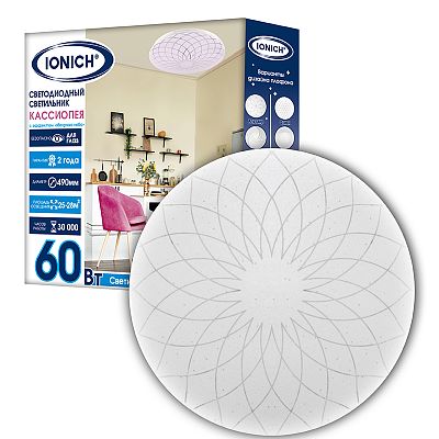 К светотехнике на любом объекте, будь то жилое помещение или коммерческая площадка, предъявляют высокие требования. Необходимо не только продумать конфигурацию всех приборов, безопасную схему подключения, суммарную мощность и нагрузку на сеть, но и учесть требования дизайна, поскольку эстетике сегодня уделяется большое внимание. Светильник светодиодный декоративный ТМ IONICH серия 2217 "Кассиопея" эффект "Звездное небо" 60 Вт 4200 Лм 230 В 6500 К 450 мм IP20 (1747) — современное решение, в котором учтены все требования. За надежность отвечают материалы с большим запасом прочности. Все элементы конструкции без проблем выдерживают интенсивную эксплуатацию. Такой вдумчивый подход к деталям является визитной карточкой бренда IONICH.