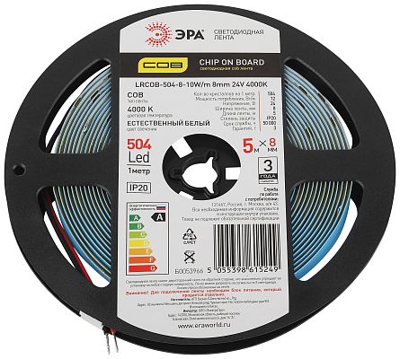 К светотехнике на любом объекте, будь то жилое помещение или коммерческая площадка, предъявляют высокие требования. Необходимо не только продумать конфигурацию всех приборов, безопасную схему подключения, суммарную мощность и нагрузку на сеть, но и учесть требования дизайна, поскольку эстетике сегодня уделяется большое внимание. Лента светодиодная ЭРА LRCOB-504-8 10W/m 8mm 24V 4000K 3year белая 5 м (Б0053966) — современное решение, в котором учтены все требования. За надежность отвечают материалы с большим запасом прочности. Все элементы конструкции без проблем выдерживают интенсивную эксплуатацию. Такой вдумчивый подход к деталям является визитной карточкой бренда ЭРА.