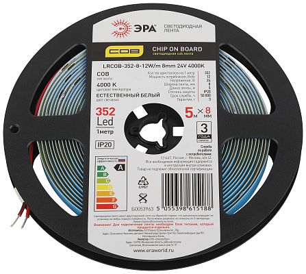 К светотехнике на любом объекте, будь то жилое помещение или коммерческая площадка, предъявляют высокие требования. Необходимо не только продумать конфигурацию всех приборов, безопасную схему подключения, суммарную мощность и нагрузку на сеть, но и учесть требования дизайна, поскольку эстетике сегодня уделяется большое внимание. Лента светодиодная ЭРА LRCOB-352-8 12W/m 8mm 24V 4000K 3year белая 5 м (Б0053963) — современное решение, в котором учтены все требования. За надежность отвечают материалы с большим запасом прочности. Все элементы конструкции без проблем выдерживают интенсивную эксплуатацию. Такой вдумчивый подход к деталям является визитной карточкой бренда ЭРА.
