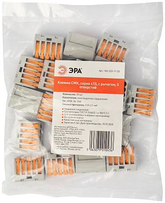 Электротехническая инфраструктура на объекте может иметь разную конфигурацию, в том числе довольно сложную со множеством подключенных потребителей, однако строгие требования к безопасности неизменны. Они прописаны в отраслевых стандартах и другой нормативной документации. И зависит итоговый результат непосредственно от качества электромонтажа и используемых комплектующих. Клемма ЭРА СМК серия 415 с рычагом 5 отверстий 0.08-2.5мм2 упаковка 20 шт (Б0057071) — небольшая, но очень важная деталь, которая тоже отвечает за корректную работу оборудования. Устанавливается довольно просто, но с эксплуатационными нагрузками при этом справляется на отлично. Качество гарантировано многоступенчатым контролем на заводе ЭРА. При заказе уточните артикул Б0057071 и количество позиций.