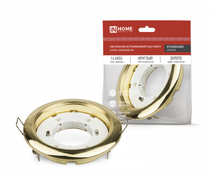 К светотехнике на любом объекте, будь то жилое помещение или коммерческая площадка, предъявляют высокие требования. Необходимо не только продумать конфигурацию всех приборов, безопасную схему подключения, суммарную мощность и нагрузку на сеть, но и учесть требования дизайна, поскольку эстетике сегодня уделяется большое внимание. Светильник встраиваемый GX53R-standard RG металл под лампу GX53 230В золото IN HOME (4690612008417) — современное решение, в котором учтены все требования. За надежность отвечают материалы с большим запасом прочности. Все элементы конструкции без проблем выдерживают интенсивную эксплуатацию. Такой вдумчивый подход к деталям является визитной карточкой бренда In Home.