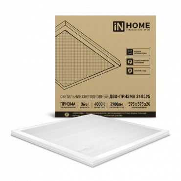 К светотехнике на любом объекте, будь то жилое помещение или коммерческая площадка, предъявляют высокие требования. Необходимо не только продумать конфигурацию всех приборов, безопасную схему подключения, суммарную мощность и нагрузку на сеть, но и учесть требования дизайна, поскольку эстетике сегодня уделяется большое внимание. Светильник светодиодный ДВО-ПРИЗМА 36П595 36Вт 4000К 3900Лм 110Лм/Вт 595х595х19 IN HOME (4690612034546) — современное решение, в котором учтены все требования. За надежность отвечают материалы с большим запасом прочности. Все элементы конструкции без проблем выдерживают интенсивную эксплуатацию. Такой вдумчивый подход к деталям является визитной карточкой бренда In Home.