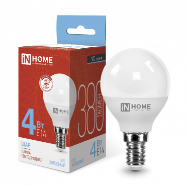 К светотехнике на любом объекте, будь то жилое помещение или коммерческая площадка, предъявляют высокие требования. Необходимо не только продумать конфигурацию всех приборов, безопасную схему подключения, суммарную мощность и нагрузку на сеть, но и учесть требования дизайна, поскольку эстетике сегодня уделяется большое внимание. Лампа светодиодная LED-ШАР-VC 4Вт 230В Е14 6500К 380Лм IN HOME (4690612030555) — современное решение, в котором учтены все требования. За надежность отвечают материалы с большим запасом прочности. Все элементы конструкции без проблем выдерживают интенсивную эксплуатацию. Такой вдумчивый подход к деталям является визитной карточкой бренда In Home.