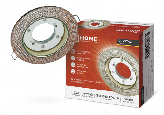 К светотехнике на любом объекте, будь то жилое помещение или коммерческая площадка, предъявляют высокие требования. Необходимо не только продумать конфигурацию всех приборов, безопасную схему подключения, суммарную мощность и нагрузку на сеть, но и учесть требования дизайна, поскольку эстетике сегодня уделяется большое внимание. Светильник встраиваемый GX53R-crystal R43L под лампу GX53 с подсветкой 230B Светло-Золотистый/ Золото IN HOME (4690612016207) — современное решение, в котором учтены все требования. За надежность отвечают материалы с большим запасом прочности. Все элементы конструкции без проблем выдерживают интенсивную эксплуатацию. Такой вдумчивый подход к деталям является визитной карточкой бренда In Home.
