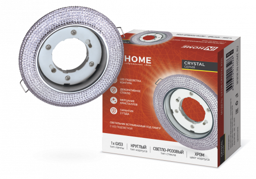 К светотехнике на любом объекте, будь то жилое помещение или коммерческая площадка, предъявляют высокие требования. Необходимо не только продумать конфигурацию всех приборов, безопасную схему подключения, суммарную мощность и нагрузку на сеть, но и учесть требования дизайна, поскольку эстетике сегодня уделяется большое внимание. Светильник встраиваемый GX53R-crystal R32L под лампу GX53 с подсветкой 230B Светло-Розовый/Хром IN HOME (4690612016528) — современное решение, в котором учтены все требования. За надежность отвечают материалы с большим запасом прочности. Все элементы конструкции без проблем выдерживают интенсивную эксплуатацию. Такой вдумчивый подход к деталям является визитной карточкой бренда In Home.
