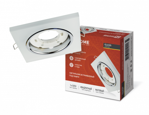 К светотехнике на любом объекте, будь то жилое помещение или коммерческая площадка, предъявляют высокие требования. Необходимо не только продумать конфигурацию всех приборов, безопасную схему подключения, суммарную мощность и нагрузку на сеть, но и учесть требования дизайна, поскольку эстетике сегодня уделяется большое внимание. Светильник встраиваемый GX53R-glass SMT под лампу GX53 КВАДРАТ матовый IN HOME (4690612014111) — современное решение, в котором учтены все требования. За надежность отвечают материалы с большим запасом прочности. Все элементы конструкции без проблем выдерживают интенсивную эксплуатацию. Такой вдумчивый подход к деталям является визитной карточкой бренда In Home.