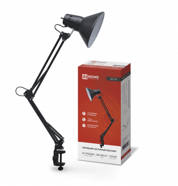 К светотехнике на любом объекте, будь то жилое помещение или коммерческая площадка, предъявляют высокие требования. Необходимо не только продумать конфигурацию всех приборов, безопасную схему подключения, суммарную мощность и нагрузку на сеть, но и учесть требования дизайна, поскольку эстетике сегодня уделяется большое внимание. Светильник настольный под лампу на струбцине СНС 13Ч 60Вт E27 230В ЧЕРНЫЙ IN HOME (4690612012735) — современное решение, в котором учтены все требования. За надежность отвечают материалы с большим запасом прочности. Все элементы конструкции без проблем выдерживают интенсивную эксплуатацию. Такой вдумчивый подход к деталям является визитной карточкой бренда In Home.