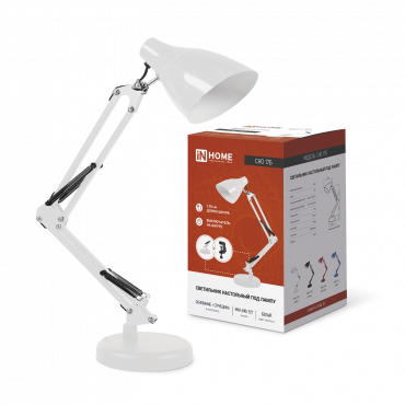 К светотехнике на любом объекте, будь то жилое помещение или коммерческая площадка, предъявляют высокие требования. Необходимо не только продумать конфигурацию всех приборов, безопасную схему подключения, суммарную мощность и нагрузку на сеть, но и учесть требования дизайна, поскольку эстетике сегодня уделяется большое внимание. Светильник настольный под лампу на основании + струбцина СНО 17Б 60Вт E27 230В БЕЛЫЙ IN HOME (4690612037226) — современное решение, в котором учтены все требования. За надежность отвечают материалы с большим запасом прочности. Все элементы конструкции без проблем выдерживают интенсивную эксплуатацию. Такой вдумчивый подход к деталям является визитной карточкой бренда In Home.