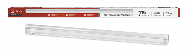К светотехнике на любом объекте, будь то жилое помещение или коммерческая площадка, предъявляют высокие требования. Необходимо не только продумать конфигурацию всех приборов, безопасную схему подключения, суммарную мощность и нагрузку на сеть, но и учесть требования дизайна, поскольку эстетике сегодня уделяется большое внимание. Светильник светодиодный СПБ-Т5 7Вт 230В 4000К 630Лм 600мм IN HOME (4690612003030) — современное решение, в котором учтены все требования. За надежность отвечают материалы с большим запасом прочности. Все элементы конструкции без проблем выдерживают интенсивную эксплуатацию. Такой вдумчивый подход к деталям является визитной карточкой бренда In Home.