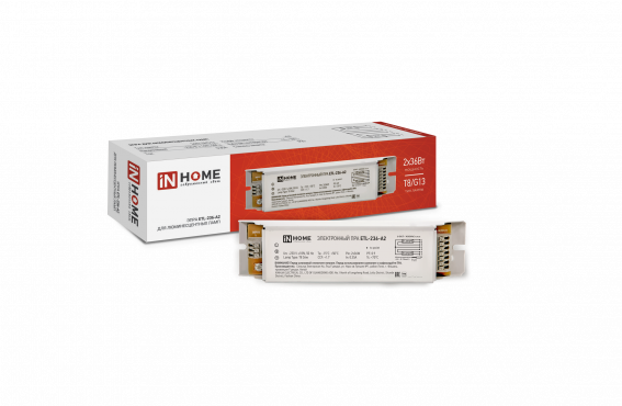 К светотехнике на любом объекте, будь то жилое помещение или коммерческая площадка, предъявляют высокие требования. Необходимо не только продумать конфигурацию всех приборов, безопасную схему подключения, суммарную мощность и нагрузку на сеть, но и учесть требования дизайна, поскольку эстетике сегодня уделяется большое внимание. ЭПРА для люминесцентных ламп ETL-236-А2 2х36Вт Т8/G13 IN HOME (4690612032870) — современное решение, в котором учтены все требования. За надежность отвечают материалы с большим запасом прочности. Все элементы конструкции без проблем выдерживают интенсивную эксплуатацию. Такой вдумчивый подход к деталям является визитной карточкой бренда In Home.