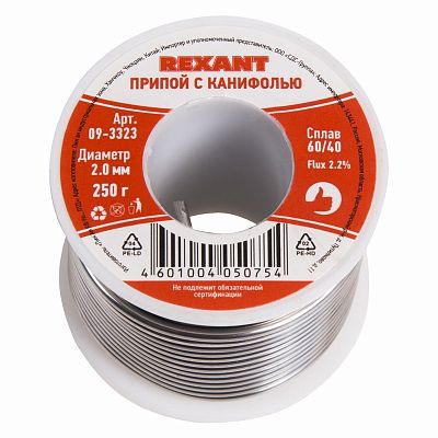 Залогом качественного электромонтажа является правильный выбор расходников и инструмента. Припой с канифолью, 250г, Ø2мм, (олово 60%, свинец 40%), катушка REXANT (09-3323) — проверенное решение, с которым работа пойдет гораздо быстрее, а результат будет соответствовать строгим отраслевым стандартам и другим нормативным требованиям. Позиция 09-3323 пользуется спросом и у профессионалов, обслуживающих сложные и ответственные объекты, и у обычных пользователей, которые сталкиваются с аналогичными задачами в быту. Работать с товарами Rexant действительно просто, а их быструю доставку мы берем на себя.