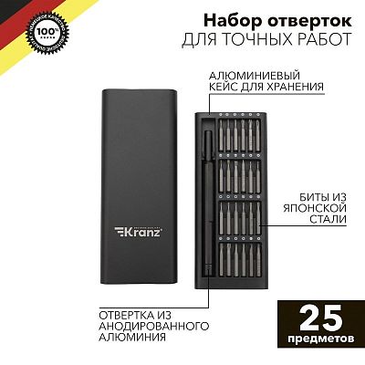 Залогом качественного электромонтажа является правильный выбор расходников и инструмента. Набор отверток для точных работ RA-03, 25 предметов KRANZ (KR-12-4753) — проверенное решение, с которым работа пойдет гораздо быстрее, а результат будет соответствовать строгим отраслевым стандартам и другим нормативным требованиям. Позиция KR-12-4753 пользуется спросом и у профессионалов, обслуживающих сложные и ответственные объекты, и у обычных пользователей, которые сталкиваются с аналогичными задачами в быту. Работать с товарами Kranz действительно просто, а их быструю доставку мы берем на себя.
