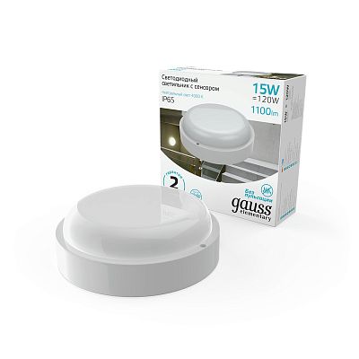 К светотехнике на любом объекте, будь то жилое помещение или коммерческая площадка, предъявляют высокие требования. Необходимо не только продумать конфигурацию всех приборов, безопасную схему подключения, суммарную мощность и нагрузку на сеть, но и учесть требования дизайна, поскольку эстетике сегодня уделяется большое внимание. Светильник светодиодный ЖКХ Gauss Elementary круг 15Вт 1100lm 4000K 160-260V IP65 d155х52мм белый с микроволновым датчиком (126411215-S) — современное решение, в котором учтены все требования. За надежность отвечают материалы с большим запасом прочности. Все элементы конструкции без проблем выдерживают интенсивную эксплуатацию. Такой вдумчивый подход к деталям является визитной карточкой бренда Gauss.