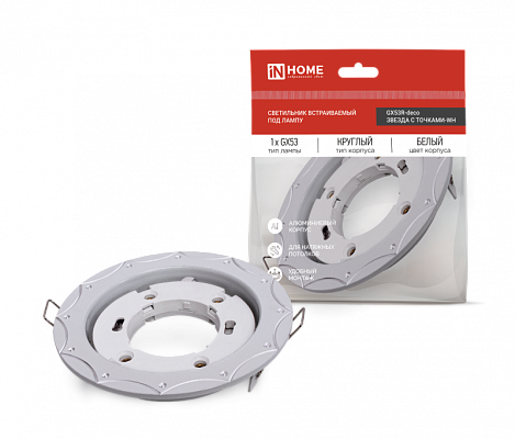 К светотехнике на любом объекте, будь то жилое помещение или коммерческая площадка, предъявляют высокие требования. Необходимо не только продумать конфигурацию всех приборов, безопасную схему подключения, суммарную мощность и нагрузку на сеть, но и учесть требования дизайна, поскольку эстетике сегодня уделяется большое внимание. Светильник встраиваемый GX53R-deco ЗВЕЗДА С ТОЧКАМИ-WH под GX53 белый IN HOME (4690612044422) — современное решение, в котором учтены все требования. За надежность отвечают материалы с большим запасом прочности. Все элементы конструкции без проблем выдерживают интенсивную эксплуатацию. Такой вдумчивый подход к деталям является визитной карточкой бренда In Home.