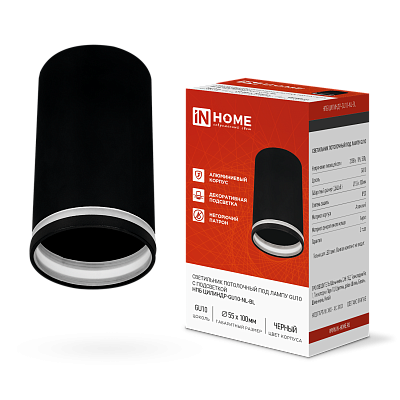 К светотехнике на любом объекте, будь то жилое помещение или коммерческая площадка, предъявляют высокие требования. Необходимо не только продумать конфигурацию всех приборов, безопасную схему подключения, суммарную мощность и нагрузку на сеть, но и учесть требования дизайна, поскольку эстетике сегодня уделяется большое внимание. Светильник потолочный НПБ ЦИЛИНДР-GU10-NL-BL под GU10 55х100мм черный IN HOME (4690612046525) — современное решение, в котором учтены все требования. За надежность отвечают материалы с большим запасом прочности. Все элементы конструкции без проблем выдерживают интенсивную эксплуатацию. Такой вдумчивый подход к деталям является визитной карточкой бренда In Home.