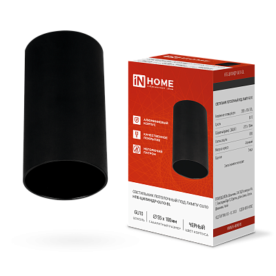 К светотехнике на любом объекте, будь то жилое помещение или коммерческая площадка, предъявляют высокие требования. Необходимо не только продумать конфигурацию всех приборов, безопасную схему подключения, суммарную мощность и нагрузку на сеть, но и учесть требования дизайна, поскольку эстетике сегодня уделяется большое внимание. Светильник потолочный НПБ ЦИЛИНДР-GU10-BL под GU10 55х100мм черный IN HOME (4690612046457) — современное решение, в котором учтены все требования. За надежность отвечают материалы с большим запасом прочности. Все элементы конструкции без проблем выдерживают интенсивную эксплуатацию. Такой вдумчивый подход к деталям является визитной карточкой бренда In Home.