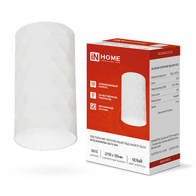 К светотехнике на любом объекте, будь то жилое помещение или коммерческая площадка, предъявляют высокие требования. Необходимо не только продумать конфигурацию всех приборов, безопасную схему подключения, суммарную мощность и нагрузку на сеть, но и учесть требования дизайна, поскольку эстетике сегодня уделяется большое внимание. Светильник потолочный НПБ DIAMOND-GU10-WH под GU10 55х100мм белый IN HOME (4690612046471) — современное решение, в котором учтены все требования. За надежность отвечают материалы с большим запасом прочности. Все элементы конструкции без проблем выдерживают интенсивную эксплуатацию. Такой вдумчивый подход к деталям является визитной карточкой бренда In Home.