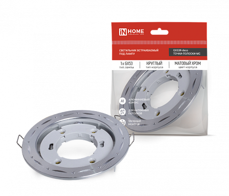 К светотехнике на любом объекте, будь то жилое помещение или коммерческая площадка, предъявляют высокие требования. Необходимо не только продумать конфигурацию всех приборов, безопасную схему подключения, суммарную мощность и нагрузку на сеть, но и учесть требования дизайна, поскольку эстетике сегодня уделяется большое внимание. Светильник встраиваемый GX53R-deco ТОЧКИ-ПОЛОСКИ-MC под GX53 матовый хром IN HOME (4690612044415) — современное решение, в котором учтены все требования. За надежность отвечают материалы с большим запасом прочности. Все элементы конструкции без проблем выдерживают интенсивную эксплуатацию. Такой вдумчивый подход к деталям является визитной карточкой бренда In Home.