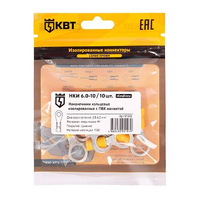 Электротехническая инфраструктура на объекте может иметь разную конфигурацию, в том числе довольно сложную со множеством подключенных потребителей, однако строгие требования к безопасности неизменны. Они прописаны в отраслевых стандартах и другой нормативной документации. И зависит итоговый результат непосредственно от качества электромонтажа и используемых комплектующих. Наконечник кабельный кольцевой изолированный НКИ 6.0–10 (10 шт) КВТ (91006) — небольшая, но очень важная деталь, которая тоже отвечает за корректную работу оборудования. Устанавливается довольно просто, но с эксплуатационными нагрузками при этом справляется на отлично. Качество гарантировано многоступенчатым контролем на заводе КВТ. При заказе уточните артикул 91006 и количество позиций.