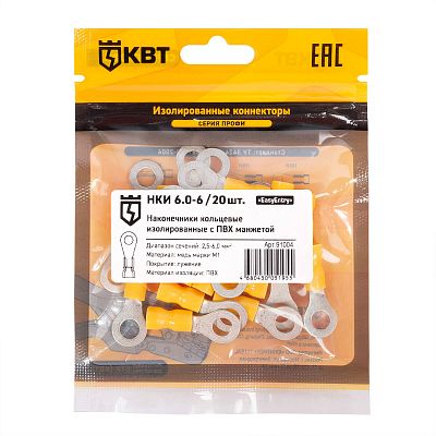 Электротехническая инфраструктура на объекте может иметь разную конфигурацию, в том числе довольно сложную со множеством подключенных потребителей, однако строгие требования к безопасности неизменны. Они прописаны в отраслевых стандартах и другой нормативной документации. И зависит итоговый результат непосредственно от качества электромонтажа и используемых комплектующих. Наконечник кабельный кольцевой изолированный НКИ 6.0–6 (20 шт) КВТ (91004) — небольшая, но очень важная деталь, которая тоже отвечает за корректную работу оборудования. Устанавливается довольно просто, но с эксплуатационными нагрузками при этом справляется на отлично. Качество гарантировано многоступенчатым контролем на заводе КВТ. При заказе уточните артикул 91004 и количество позиций.