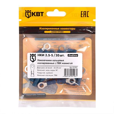 Электротехническая инфраструктура на объекте может иметь разную конфигурацию, в том числе довольно сложную со множеством подключенных потребителей, однако строгие требования к безопасности неизменны. Они прописаны в отраслевых стандартах и другой нормативной документации. И зависит итоговый результат непосредственно от качества электромонтажа и используемых комплектующих. Наконечник кабельный кольцевой изолированный НКИ 2.5–5 (30 шт) КВТ (91002) — небольшая, но очень важная деталь, которая тоже отвечает за корректную работу оборудования. Устанавливается довольно просто, но с эксплуатационными нагрузками при этом справляется на отлично. Качество гарантировано многоступенчатым контролем на заводе КВТ. При заказе уточните артикул 91002 и количество позиций.