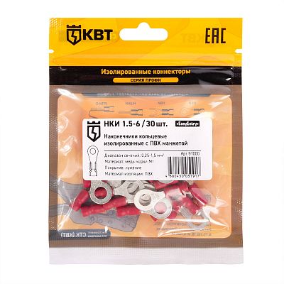 Электротехническая инфраструктура на объекте может иметь разную конфигурацию, в том числе довольно сложную со множеством подключенных потребителей, однако строгие требования к безопасности неизменны. Они прописаны в отраслевых стандартах и другой нормативной документации. И зависит итоговый результат непосредственно от качества электромонтажа и используемых комплектующих. Наконечник кабельный кольцевой изолированный НКИ 1.5–6 (30 шт) КВТ (91000) — небольшая, но очень важная деталь, которая тоже отвечает за корректную работу оборудования. Устанавливается довольно просто, но с эксплуатационными нагрузками при этом справляется на отлично. Качество гарантировано многоступенчатым контролем на заводе КВТ. При заказе уточните артикул 91000 и количество позиций.