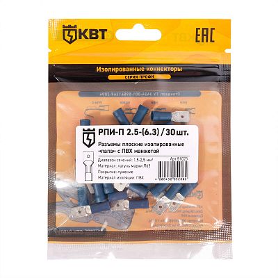 Электротехническая инфраструктура на объекте может иметь разную конфигурацию, в том числе довольно сложную со множеством подключенных потребителей, однако строгие требования к безопасности неизменны. Они прописаны в отраслевых стандартах и другой нормативной документации. И зависит итоговый результат непосредственно от качества электромонтажа и используемых комплектующих. Разъем кабельный плоский изолированный «папа» РПИ-П 2.5-(6.3) (30 шт) с ПВХ манжетой КВТ (91023) — небольшая, но очень важная деталь, которая тоже отвечает за корректную работу оборудования. Устанавливается довольно просто, но с эксплуатационными нагрузками при этом справляется на отлично. Качество гарантировано многоступенчатым контролем на заводе КВТ. При заказе уточните артикул 91023 и количество позиций.